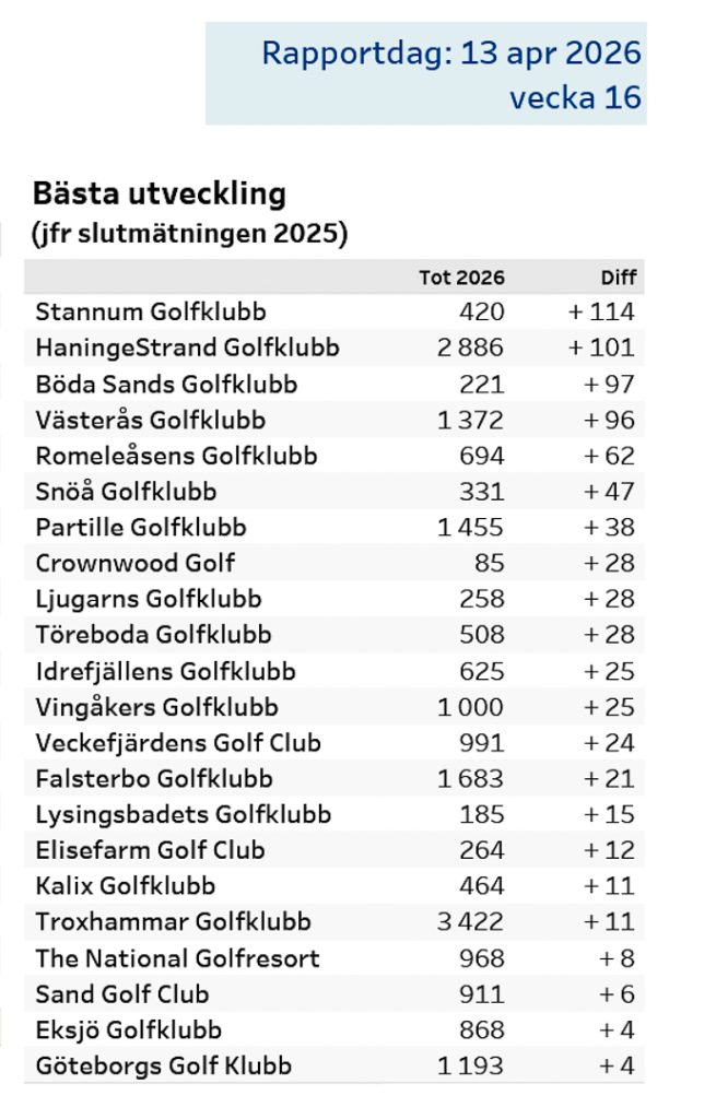 Svenska Golfförbundet presenterar varje vecka statistik på medlemsutvecklingen på klubbnivå i Sverige. Enligt den senaste rapporten (vecka 16, 2026) har GolfStar Stannum ökat med +114 spelare jämfört med föregående år.